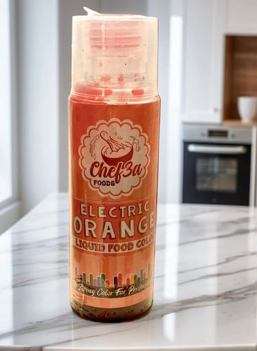 “Chef 3A Electric Orange Food Colour 120ml – bright and bold shade that makes cakes, icings, and desserts pop with vibrant energy.”